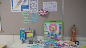 In de English corner komen dus spullen met betrekking tot diverse thema´s. Je kunt je beperken tot de thema´s die je tijdens de Engelse les gebruikt (denk aan clothes, family, toys, animals, hobbies, weather), maar je kunt ook inspelen op de thema´s waar je in de klas mee bezig bent (water, kunst, gezondheid, herfst) of in de school (Kinderboekenweek, reizen). Spelen met Engels heeft prachtige flashcards bij diverse thema’s. Als je deze lamineert en ophangt, samen met bijvoorbeeld een woordmat, wordt de English corner niet alleen aantrekkelijk, maar biedt het ook houvast aan kinderen.