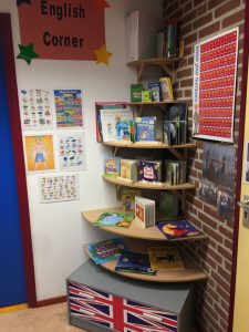 Je kunt Engels ook zichtbaar maken door in elk lokaal een English Corner te creëren. In deze ´hoek´ leg je Engelse (prenten-)boeken en spelletjes neer, hang je Engelse flashcards op en plaats je typische Engelse spulletjes (bijvoorbeeld meegebracht door de kinderen). Ook benadruk je het thema waar je op dat moment mee bezig bent. Verder kun je er een Britse vlag, ketting of hoed neerleggen, die je elke keer tevoorschijn haalt als de Engelse les begint: zo weten de leerlingen dat je vanaf nu alleen maar Engels praat.
