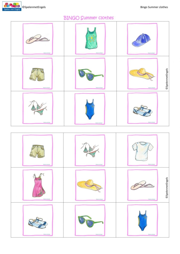 Met dit bingospel oefenen leerlingen spelenderwijs de Engelse woordjes bij het thema ´Summer clothes´ (onderdeel van de thema’s ‘summer‘ en ‘clothes‘). Het is goed te gebruiken in de inputfase, omdat leerlingen nog niet zelf hoeven te praten. Het spel bevat 20 verschillende kaarten met 12 verschillende woorden. Elke kaart heeft 9 plaatjes, dus je kunt eerst voor 1 rij gaan en daarna voor een volle kaart. Succes gegarandeerd!