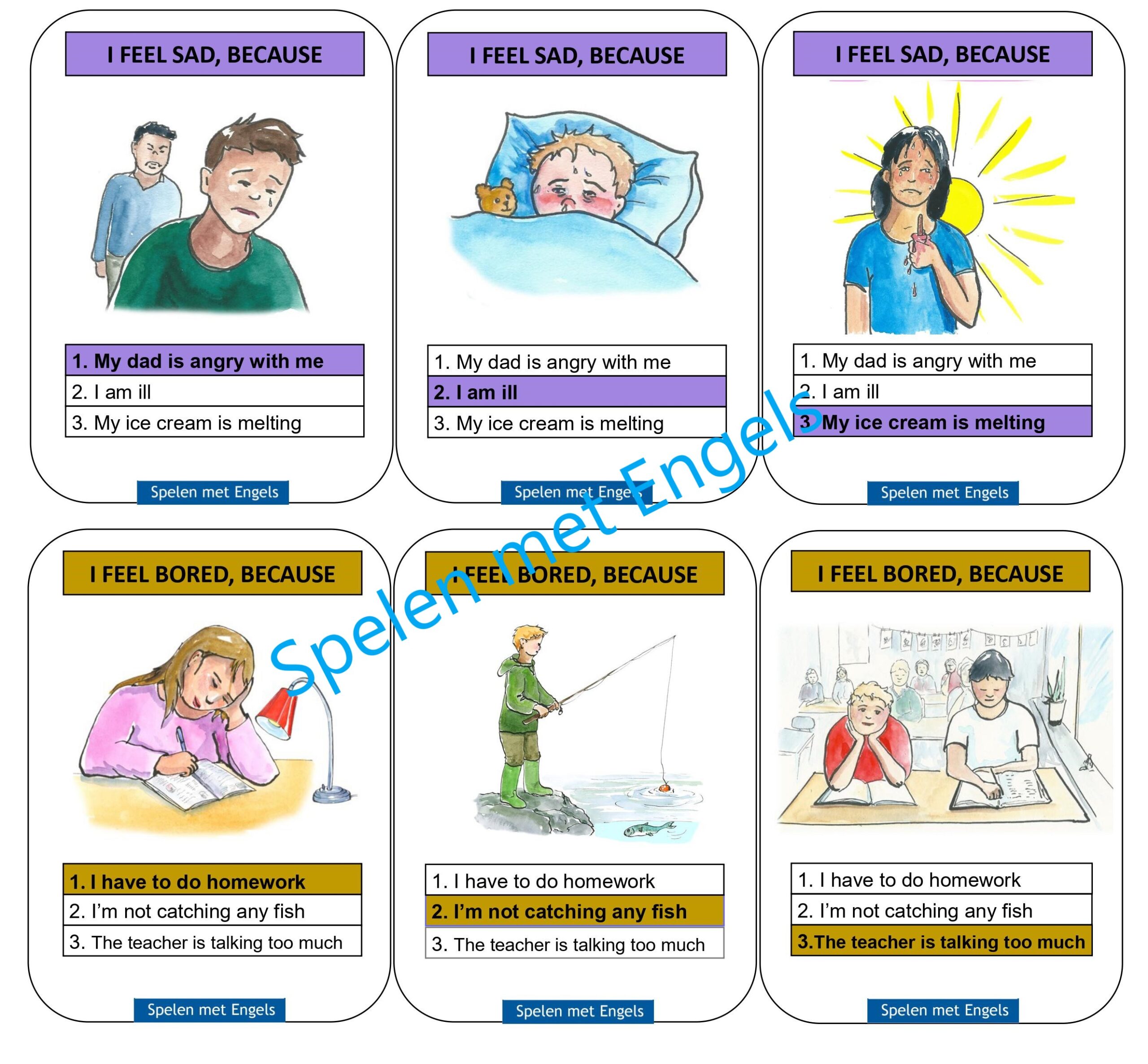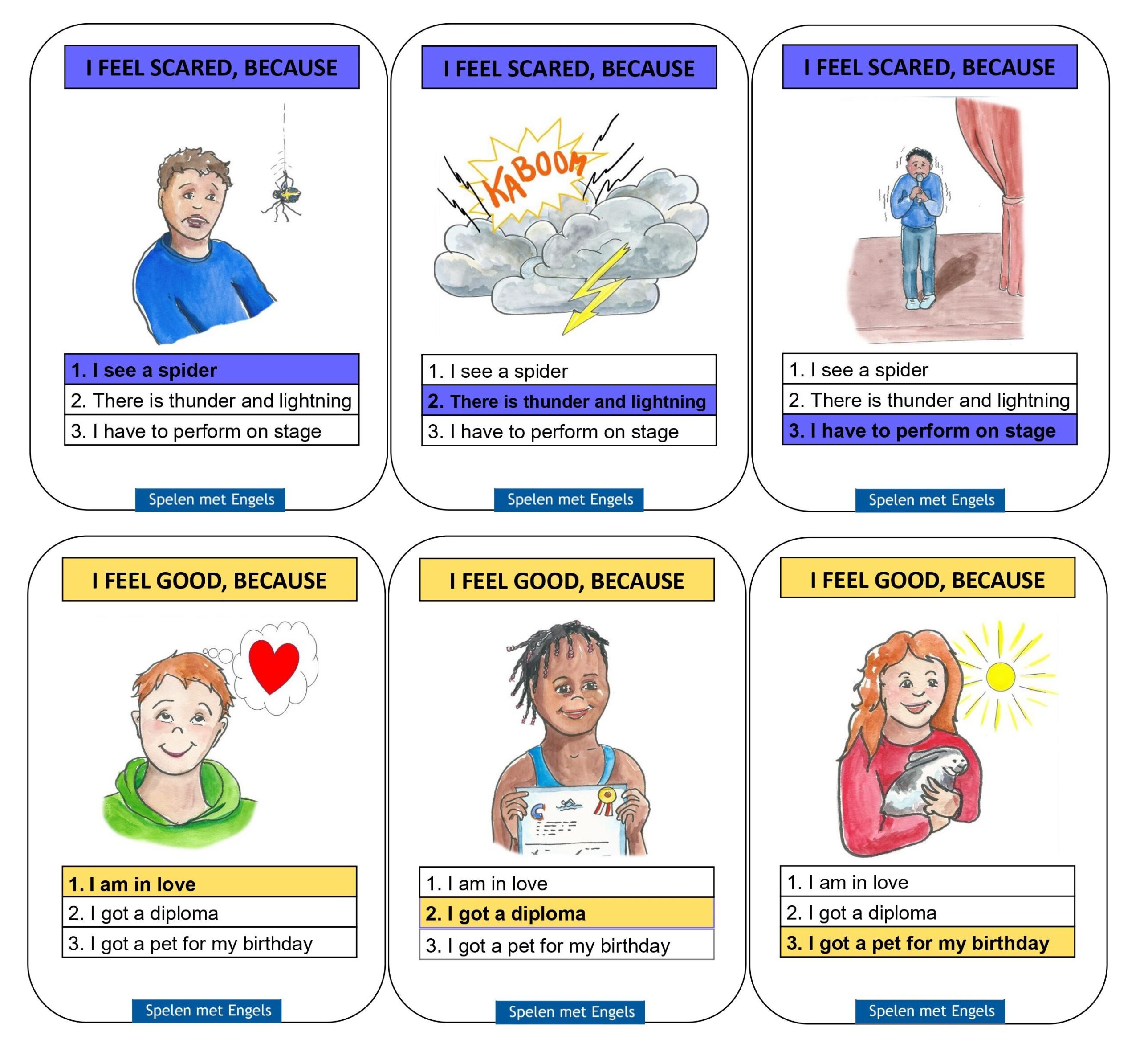 Het spel bevat 27 verschillende kaarten in 9 categorieën, zoals ‘I feel relaxed because’, ‘I feel happy because’ en ‘I feel proud because’. Elke categorie heeft een eigen kleur. Print de kaarten in kleur uit, plak ze op donker papier en lamineer ze. Op deze manier zijn ze jarenlang te gebruiken in diverse groepen.