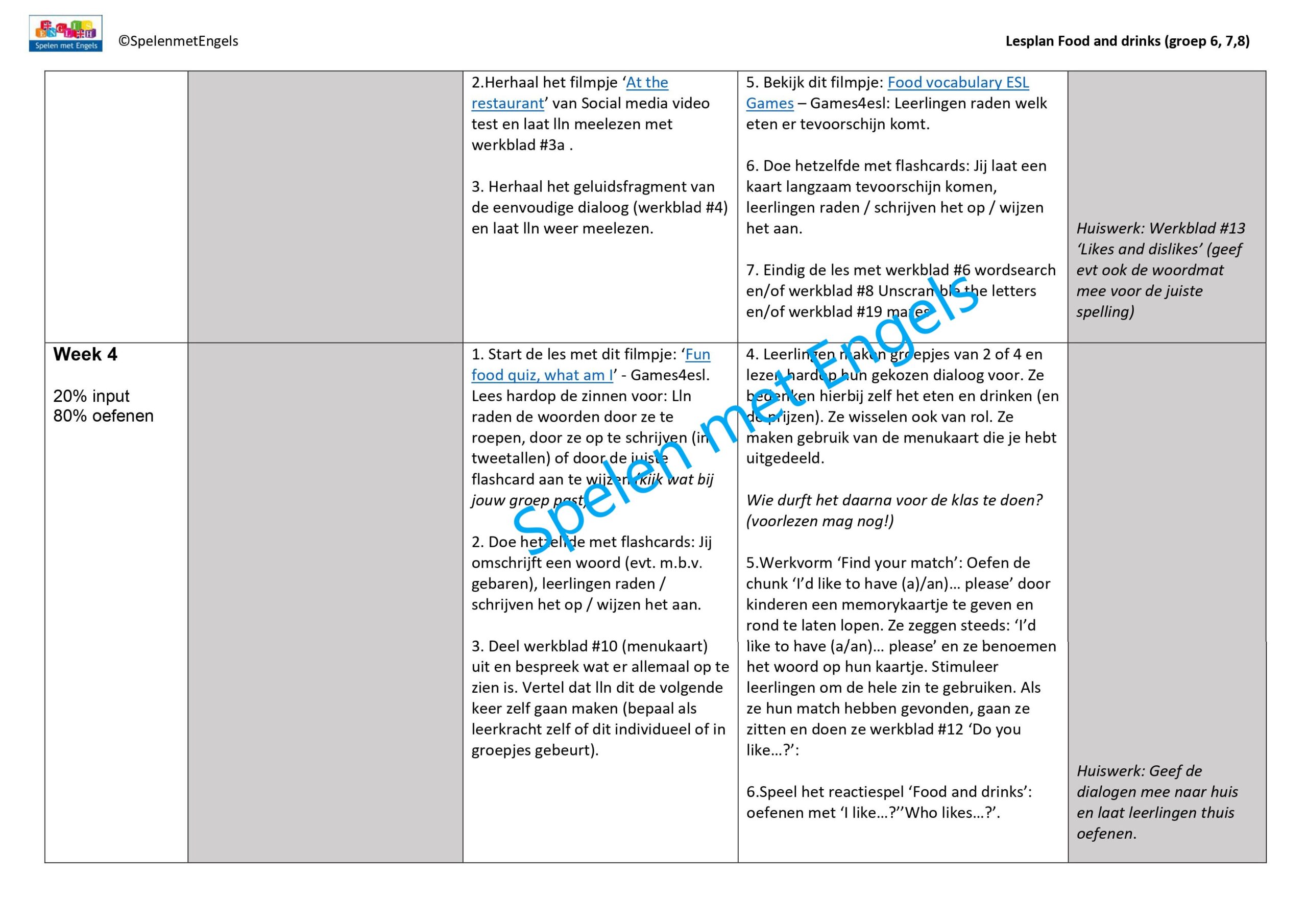 Het is gemaakt voor zes weken, waarbij je zelf bepaalt hoe je de lessen per week verdeelt. Er is uitgegaan van ongeveer 1 uur per week. Het einddoel: Leerlingen kunnen eten en drinken bestellen in een restaurant en ze kunnen een bestelling opnemen als ober/serveerster. Ook maken ze zelf een menukaart.