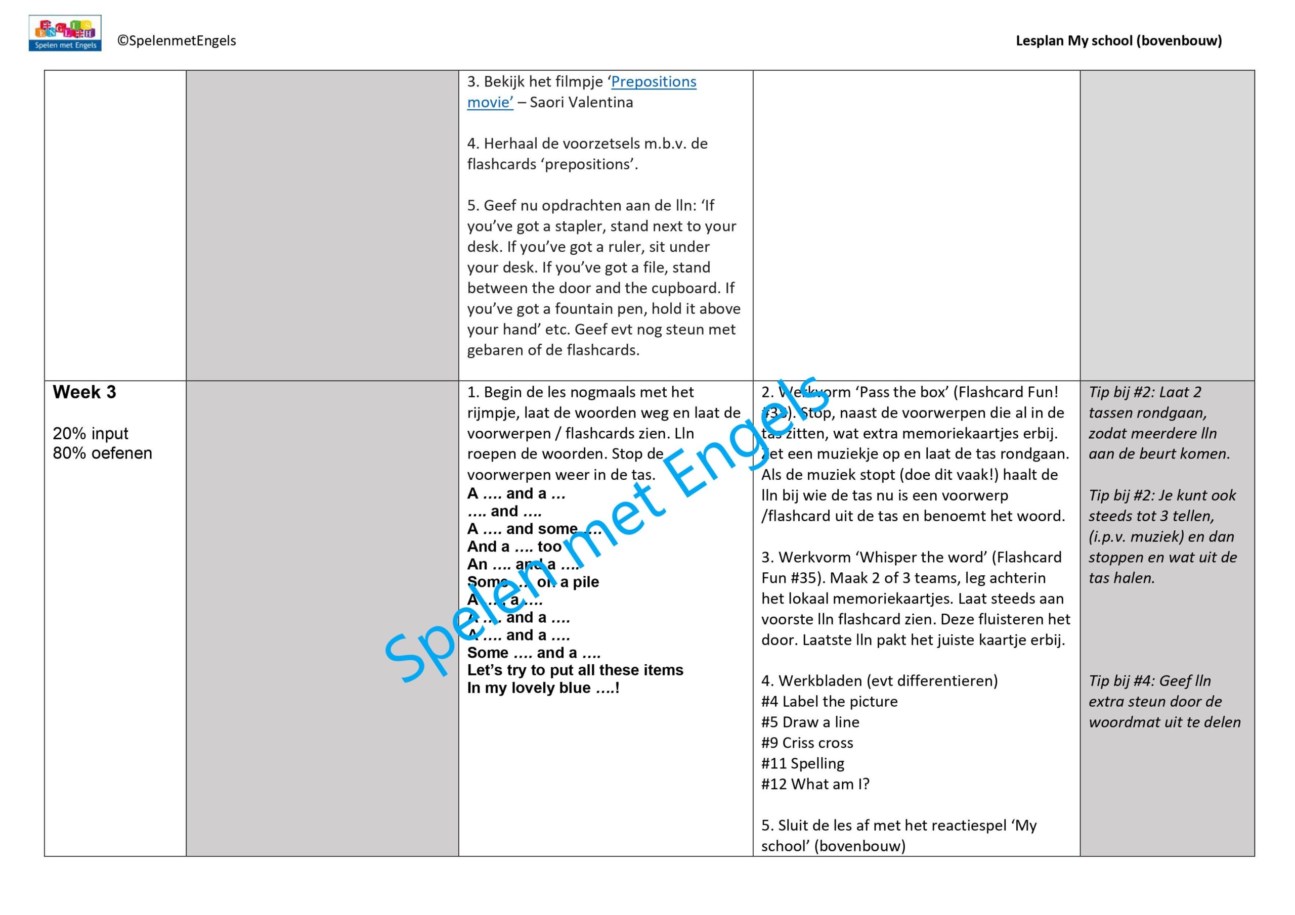Materiaal | complete lessenserie van 6 weken weken, flashcards 'prepositions' |
