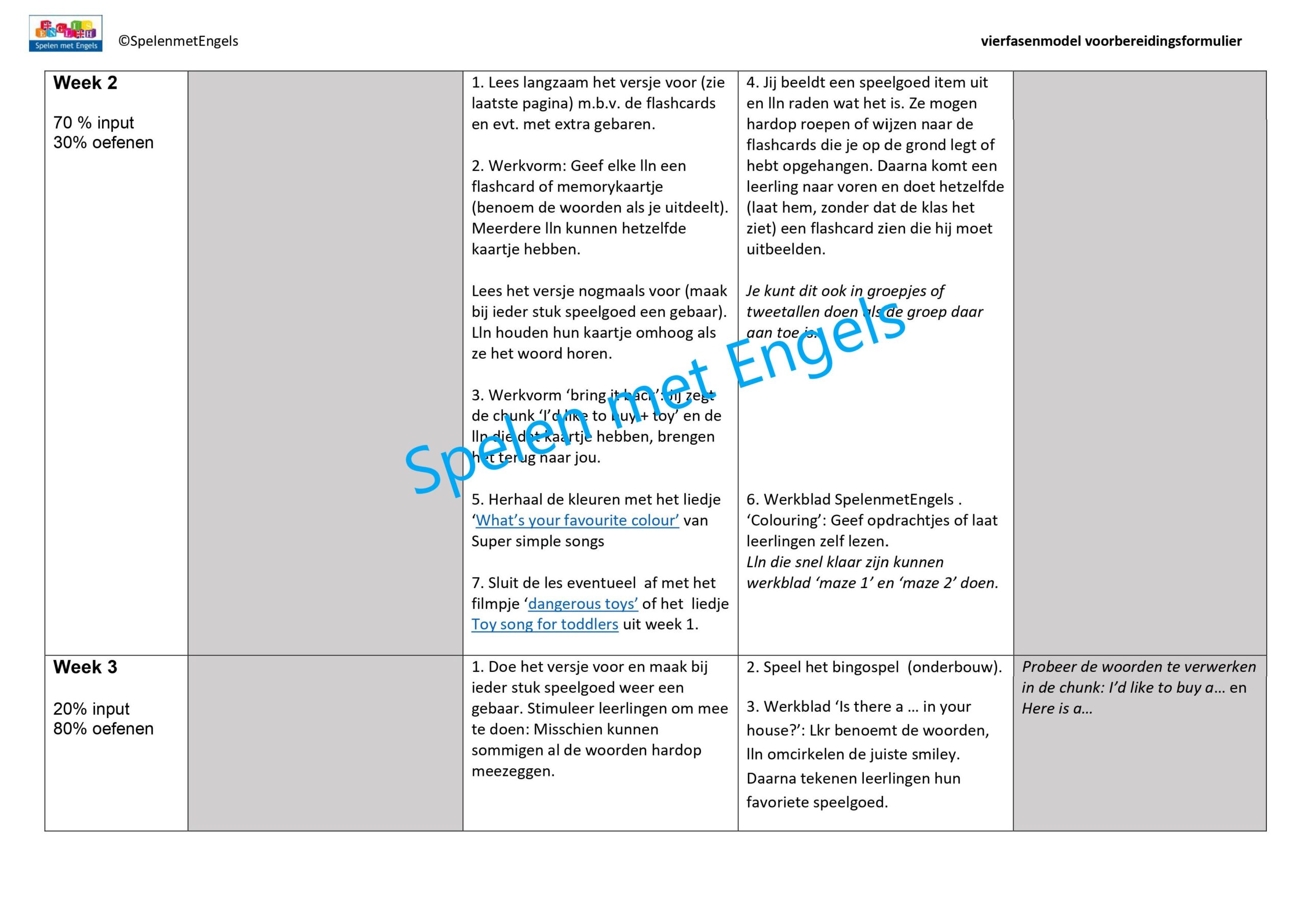 Vind je het lastig om dit lesplan goed te begrijpen? Dan raad ik je aan om (individueel) de online cursus Spelen met Engels 2 te volgen of om met het hele team de vvto-training te volgen. Dan is de opbouw van de lessen direct helder en krijg je ook meer uitleg bij de diverse werkvormen.