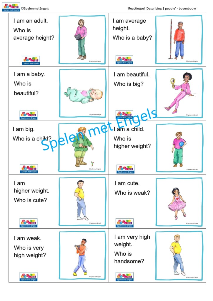 Andere spellen die hier goed bij aansluiten, zijn: Flashcards Describing people, Bordspellen Describing people, Kwartet Describing people, Memory Describing people en nog veel meer.
