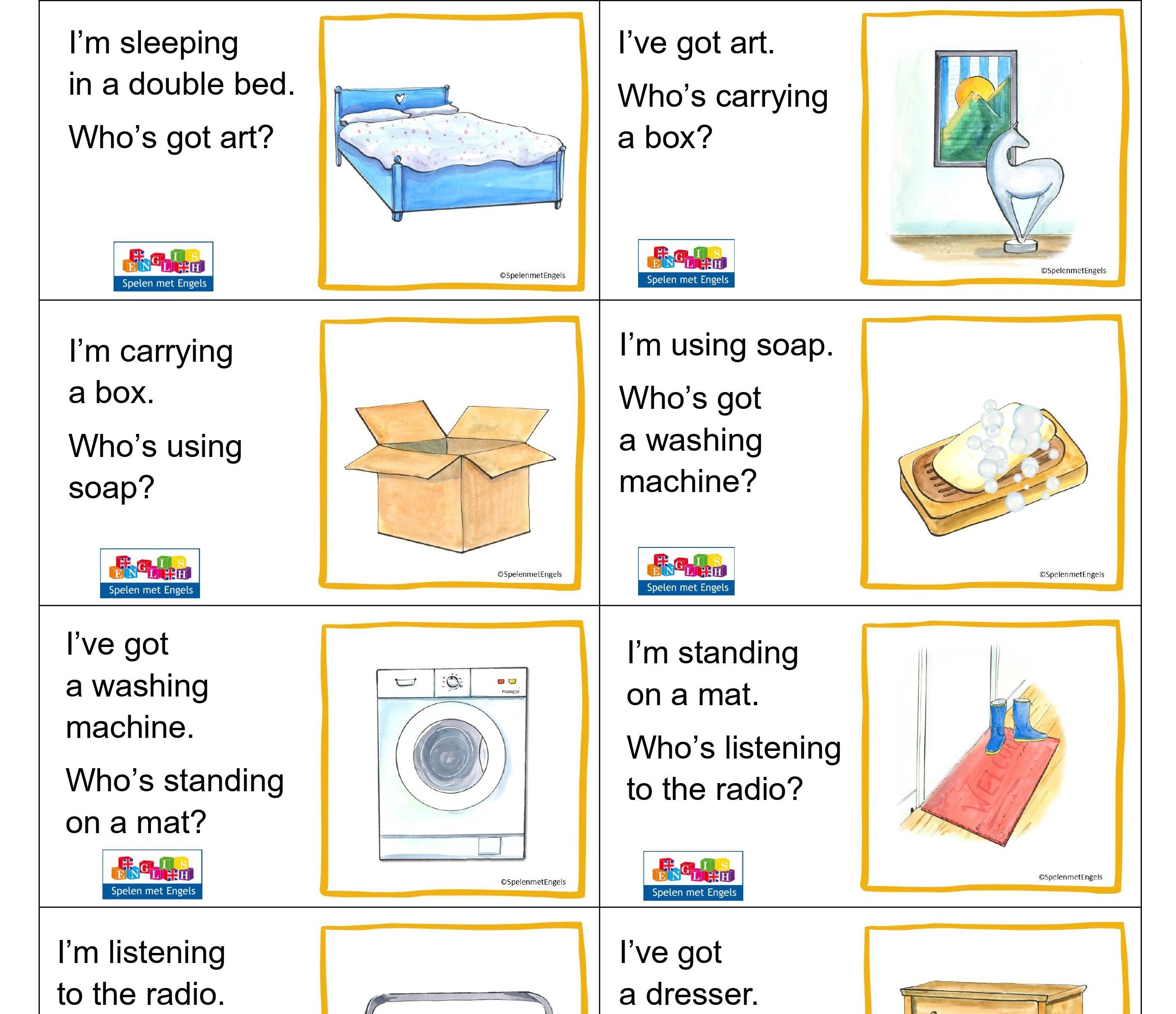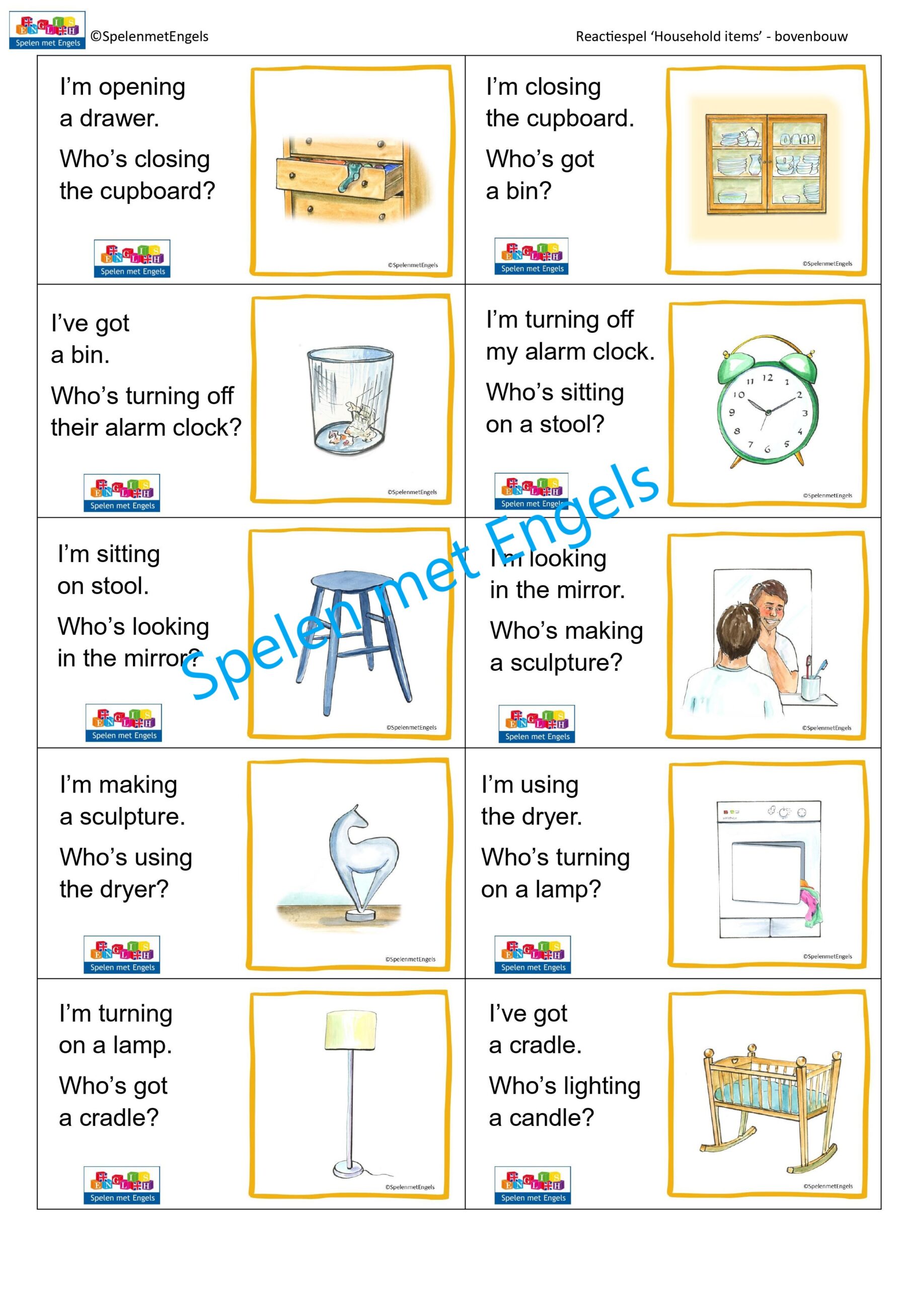 Met dit zeer uitgebreide reactiespel oefenen leerlingen in de bovenbouw spelenderwijs de Engelse woordjes bij het thema ´Household items´. Het is goed te gebruiken in de oefenfase, omdat leerlingen de zinnetjes eerst lezen en vervolgens hardop uitspreken. Door goed naar elkaar te luisteren, ontstaat er een ‘loop’ (een lus) en kom je uiteindelijk weer bij het eerste kaartje uit. Je kunt leerlingen natuurlijk ook in tweetallen of in kleine groepjes de kaarten op goede volgorde laten leggen.