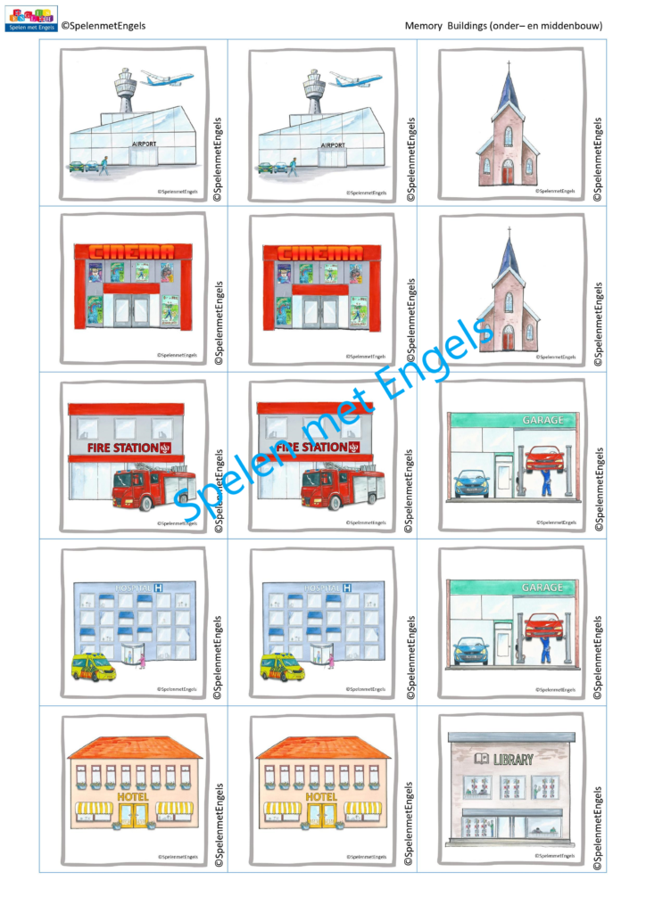 | Woorden | airport, church, cinema, fire station, garage, hospital, hotel, library, museum, police station, school, shopping centre |