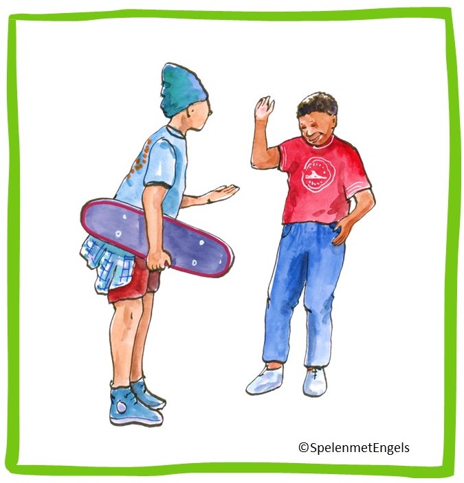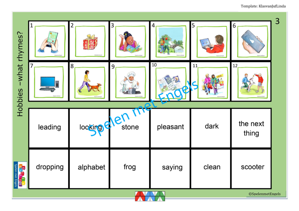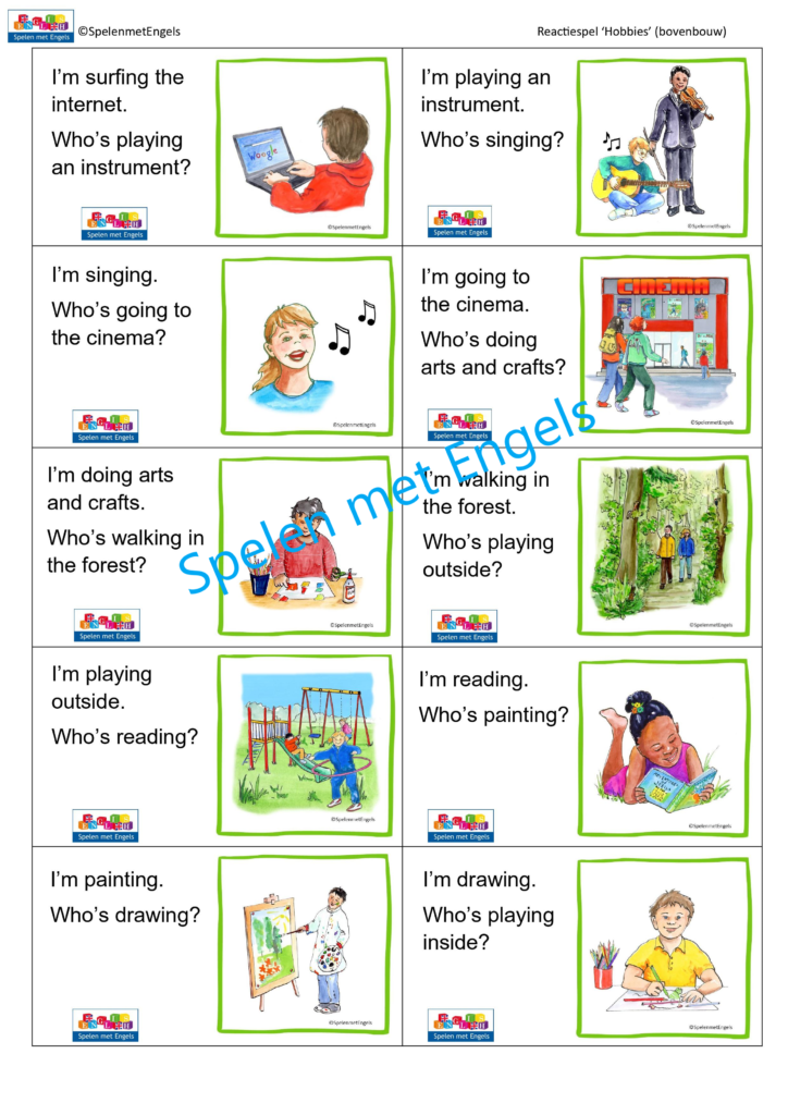| Woorden | -Werkwoorden: baking, dancing, doing arts and crafts, dressing up, drawing, gaming, painting, playing inside, playing outside, reading, watching TV, don’t like , like |