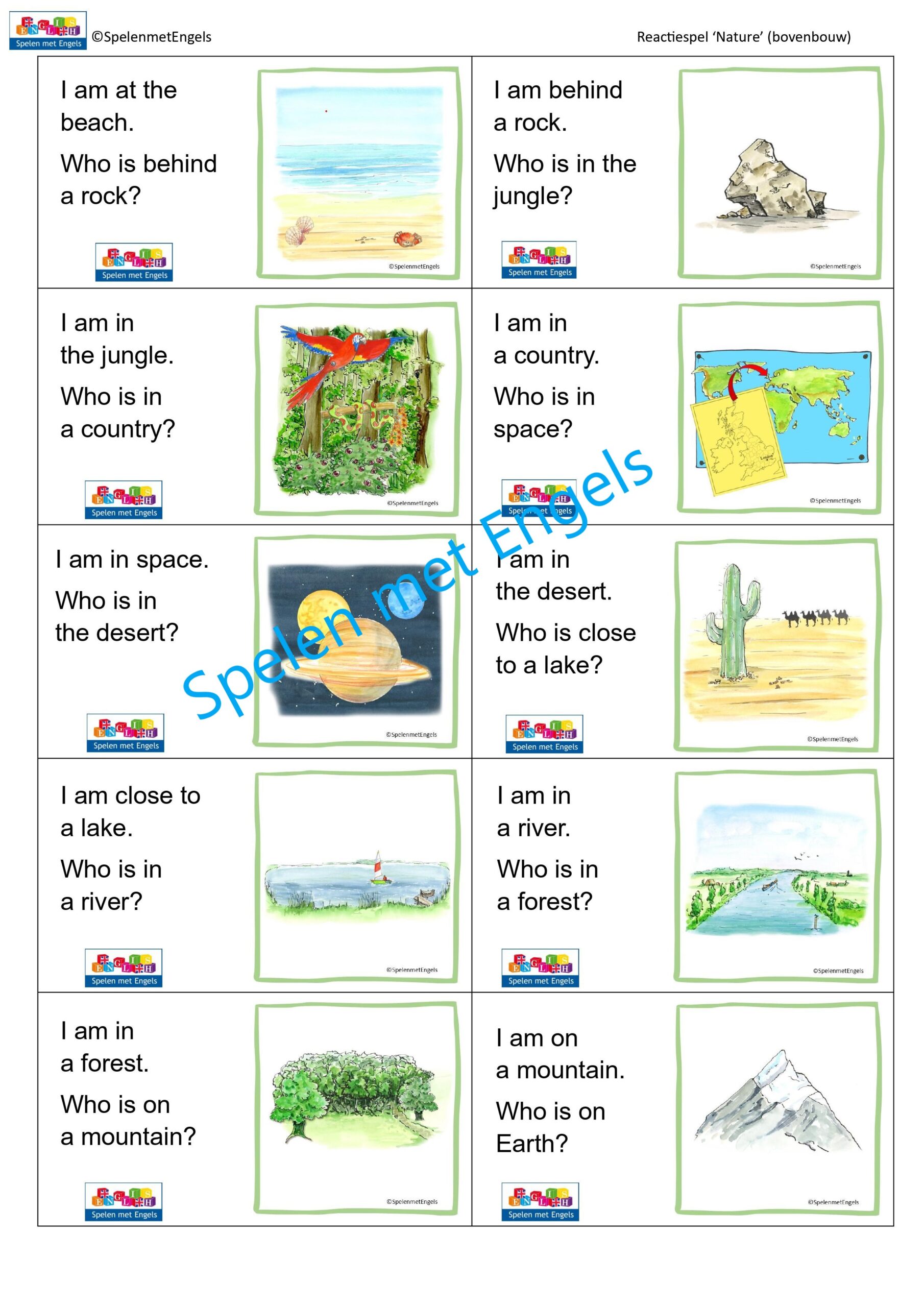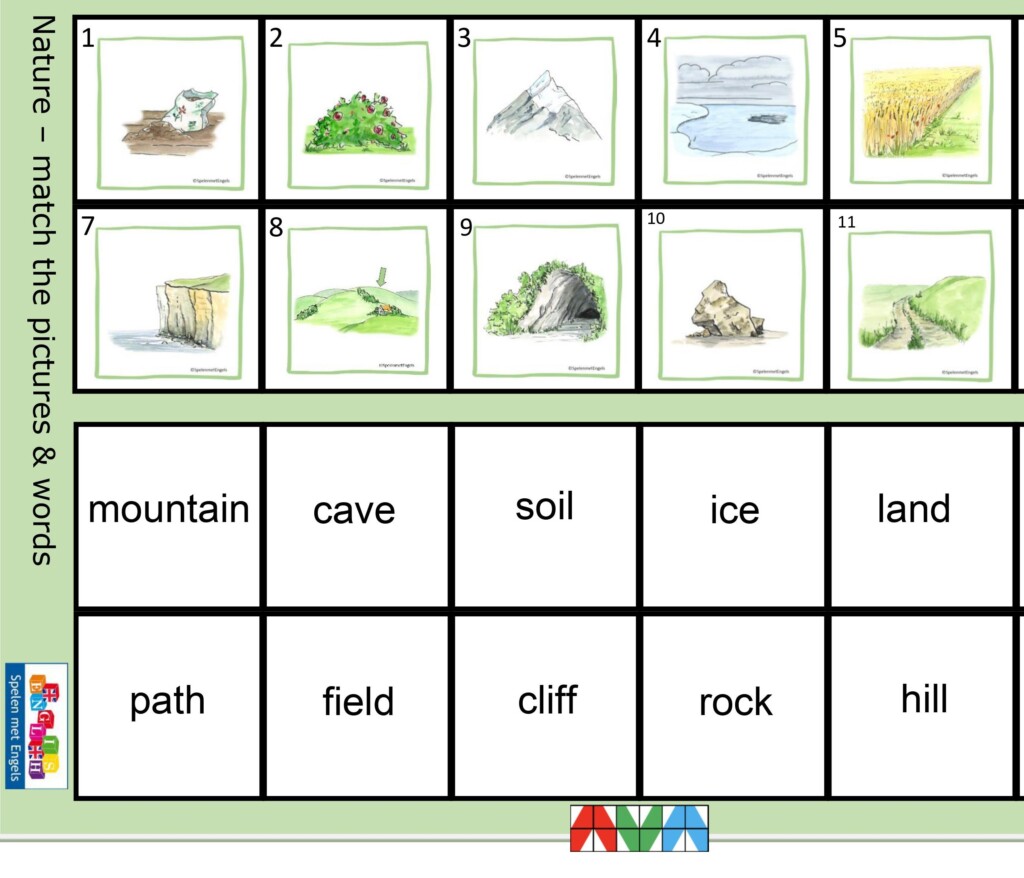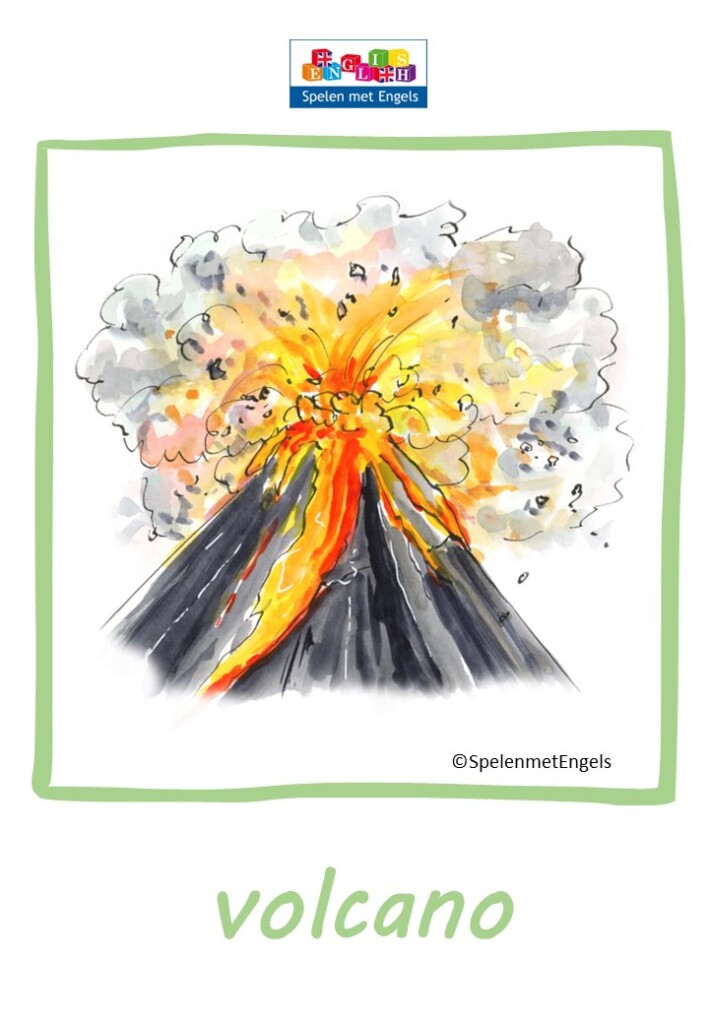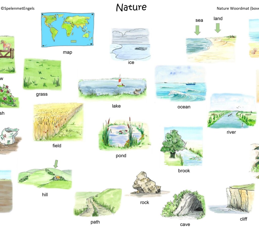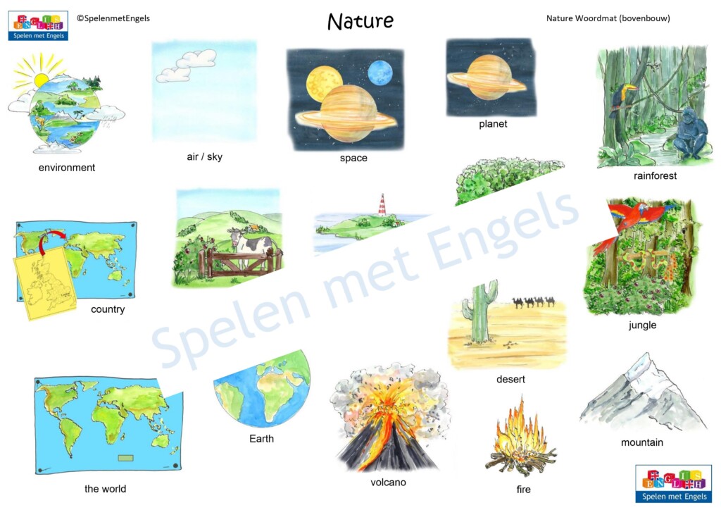 | Woorden | air / sky, beach, brook, bush, cave, cliff, country, countryside, desert, Earth, environment, field, fire, forest / woods, grass, ground, hill, ice, island, jungle, lake, land, map, meadow, mountain, ocean, path, planet, pond, rainforest, river, rock, sand, sea, soil, space, the world, volcano, waterfall Extra: aquatic animals, birds, fauna, flora, freshwater animals, insects, sea animals, underwater, wild animals |