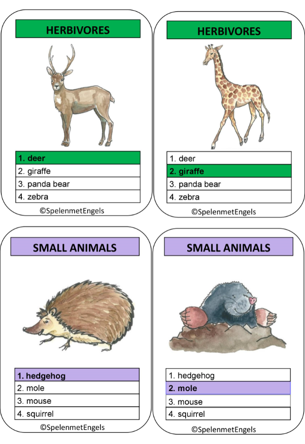 | Woorden | bear, buffalo, camel, crocodile, deer, elephant, fox, frog, giraffe, gorilla, hare, hippo, hyena, kangaroo, lion, monkey, panda bear, parrot, penguin, polar bear, rhino, snake, tiger, tortoise, toucan, turtle, wild animals, wolf, zebra |